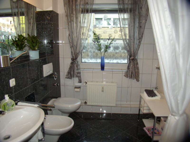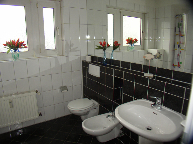 Im Sanitärbereich sind die Böden und ein Teil der Wände mit dunklen Fliesen - die übrigen Wandbereiche mit weißen Fliesen versehen. Die eleganten Bäder sind ausgestattet mit Dusche oder Badewanne, Waschbecken, WC und Bidet.