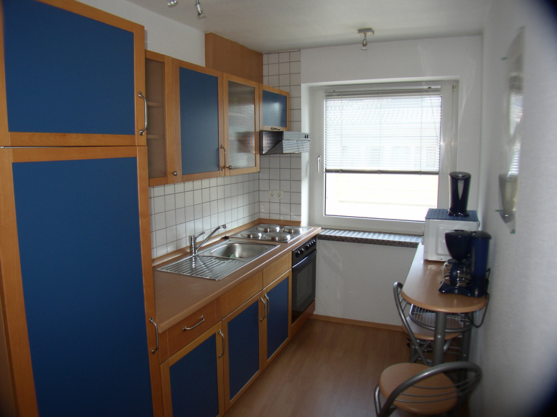 Die Einbauküchen sind mit farbigen Fronten versehen und mit vielen notwendigen Utensilien bestückt. Spüle, Herd, Kochmulde und Kühlschrank sind eingebaut. Auch eine Mikrowelle steht zur Verfügung.