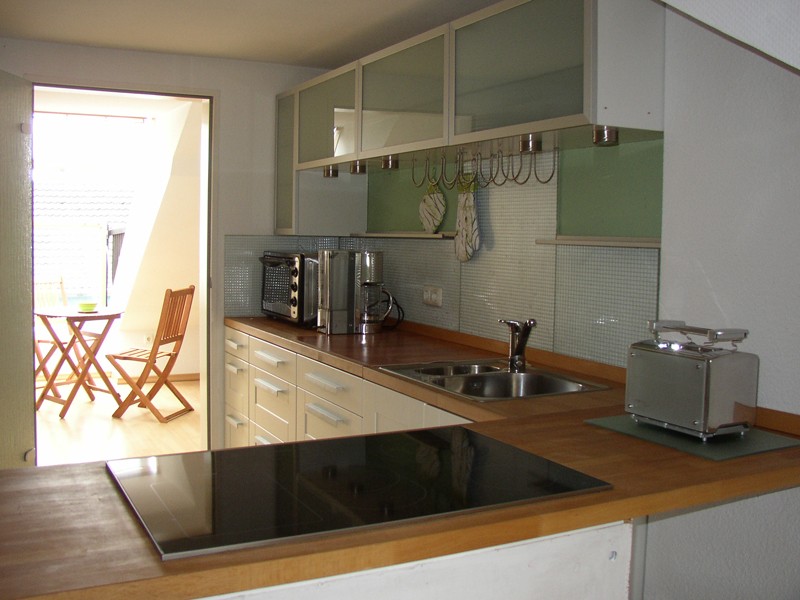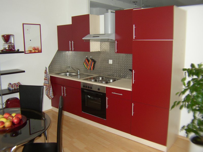 The kitchen comes with a sink, stove, cook top / ceramic hob, refrigerator, and also a microwave oven. The cabinets have coloured fronts and come with many utensils.