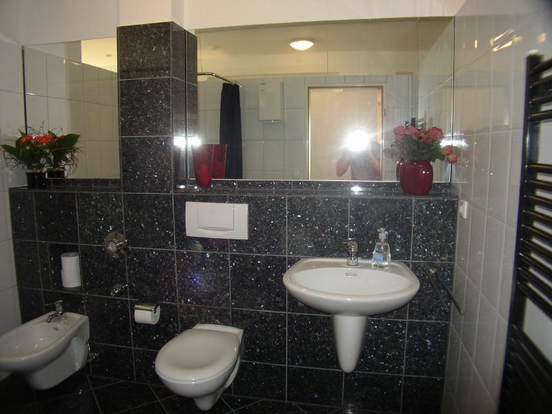 The bathrooms feature white and coloured tiles and come with sink, WC, bidet and either a shower or bathtub.